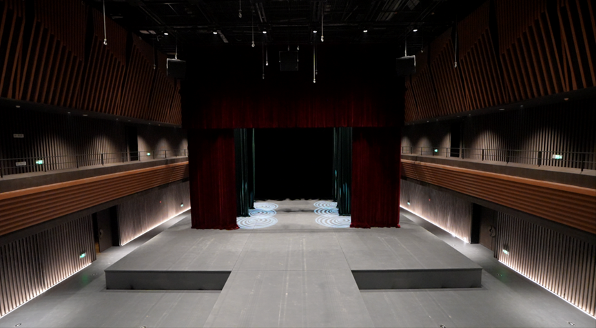 The 500-seat multifunctional hall is designed for maximum spatial flexibility. Through the coordinated use of 10 lifting platforms beneath the stage and 11 motorized hoists above, the space can be rapidly reconfigured into multiple stage formats, including end-stage, thrust stage, transverse stage, and T-stage layouts.